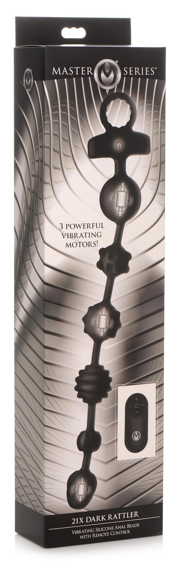 These Dark Rattler anal beads are sure to give you a sensational experience! Each of the 6 beads has a unique texture to enjoy as they are popped inside varying from curved rolls, angled ridges or firm bumps. Enjoy intense vibration from 3 powerful motors placed within the beads. Choose between 3 different speeds and 7 patterns; the vibration can be turned on in each individual bead. Use the remote control to control the vibe inside!