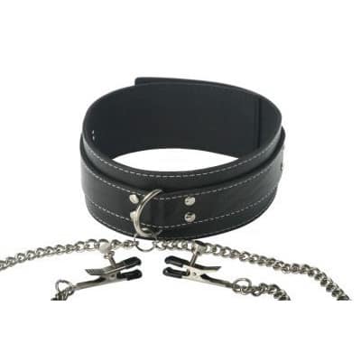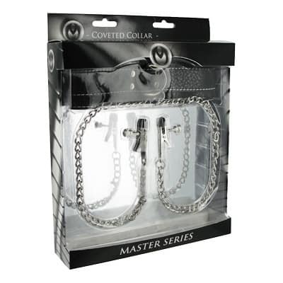 Imagine the seductive combination of PU leather and metal, collar and clamp…pleasure and pain. Master Series has your fix with the Coveted Collar and Clamp Union. This two in one set is made with submission in mind. The quality faux leather collar secures by means of a buckle and has two 12 inch chains attached to a front D-ring. Ending the chains are adjustable nipple clamps that are quickly and easily made tighter or more loose with thumb screws, so you can decide just how much punishment your naughty one requires.