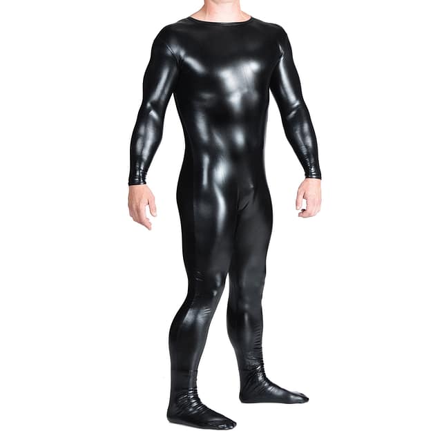 This body hugging suit is specially treated to have the shine and glisten of latex, with the stretchiness and durability of spandex. The lightweight fabric is breathable and molds to every curve. A zipper up the back allows you to easily step into it, and once on will mold itself to practically any body shape. This unisex suit is great for those who want a second skin look, or to create an enticing scene without having their face or hands covered.