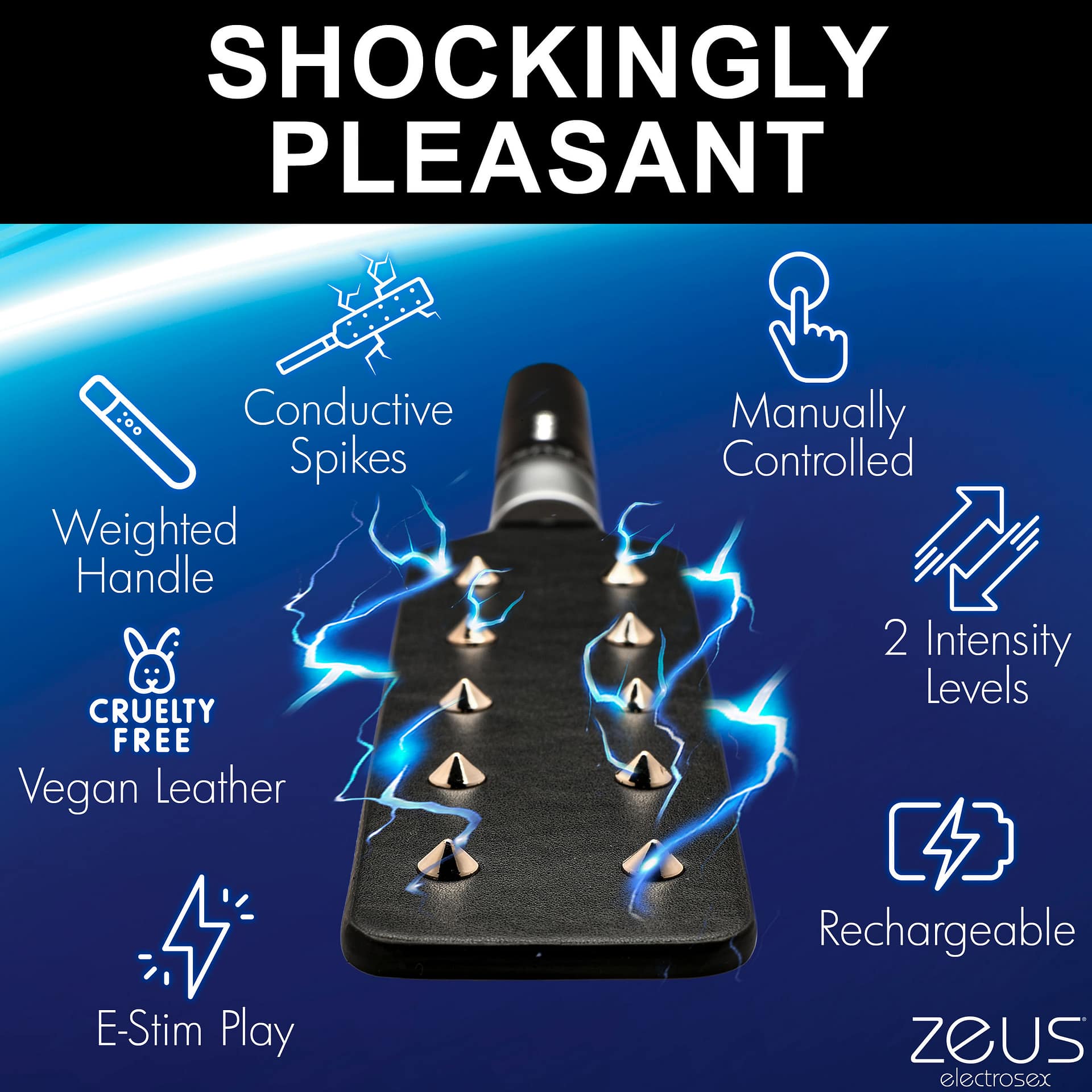 Add some bite to your spanking sessions with this E-stim Spiked Paddle! It has 10 spikes on one side that will bite into your partner’s juicy flesh like little teeth. They won’t break the skin, but they will leave a memorable sensation. Flip it over to the flat side and rub their behind to cool them down. Then amp up the intensity again by turning on the electrostimulation! Choose between two different intensities and enjoy as they get shocked by the conductive spikes! The paddle is covered in vegan-friendly, vegan leather and the metal is made out of nickel-free, zinc alloy. The e-stim paddle is rechargeable. Simply use the USB cable provided. Keep away from water.