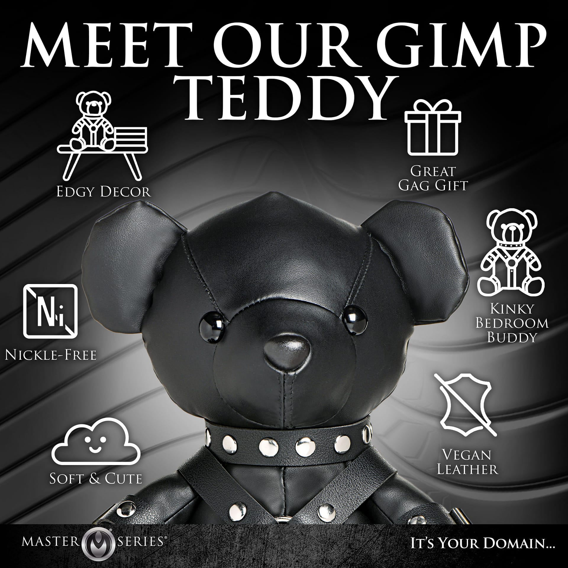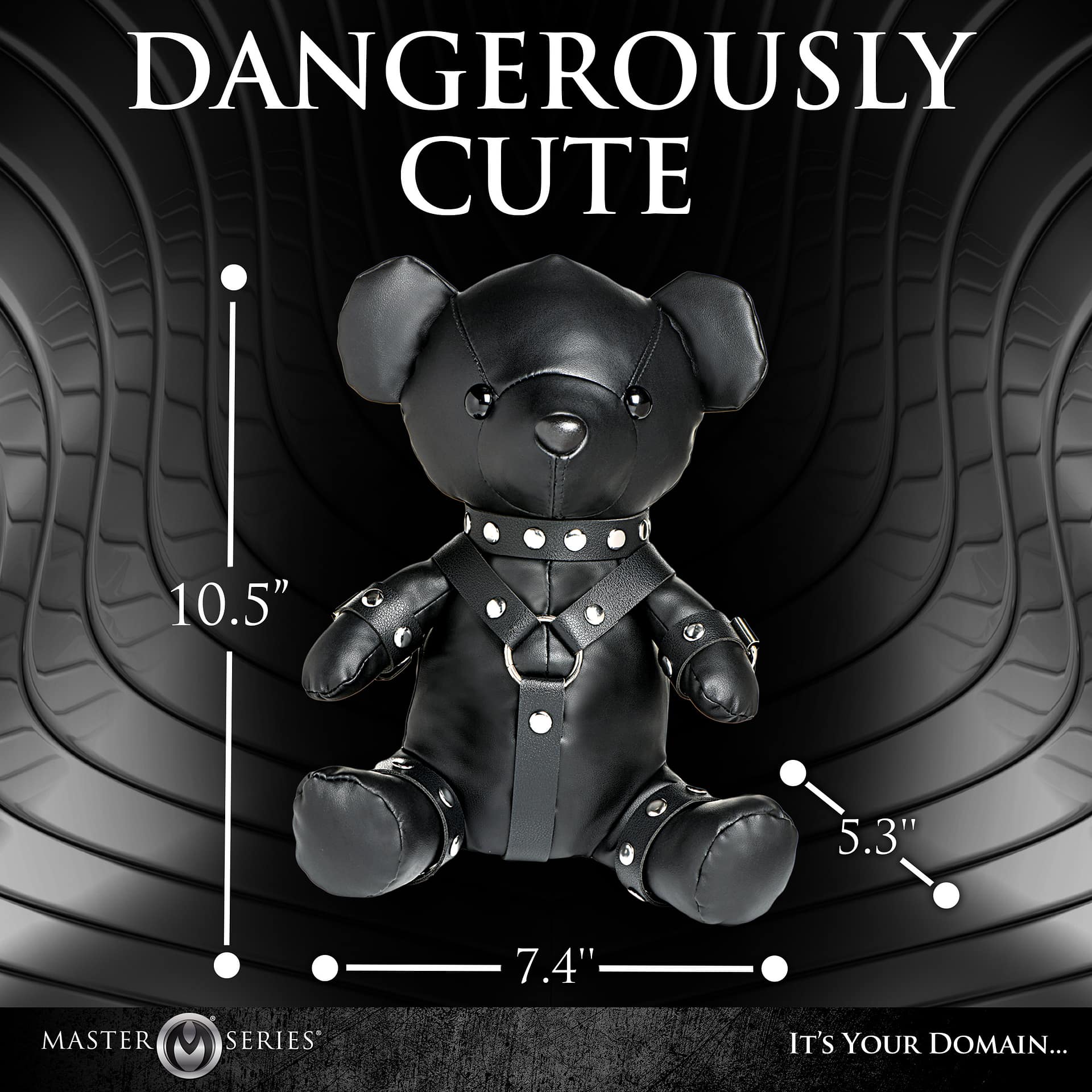 Introducing the ultimate kinky token, the Master Series Gimp Bear, the perfect blend of adorable and edgy to add a kinky twist to your collection. Crafted with high-quality vegan leather, this unique teddy bear is dressed in a meticulously designed gimp outfit that captures the essence of BDSM culture while remaining an endearing companion. It’s not just a teddy bear; it’s a statement piece that adds a playful and naughty touch to your space or your partner’s. Spot clean with a damp cloth as needed.