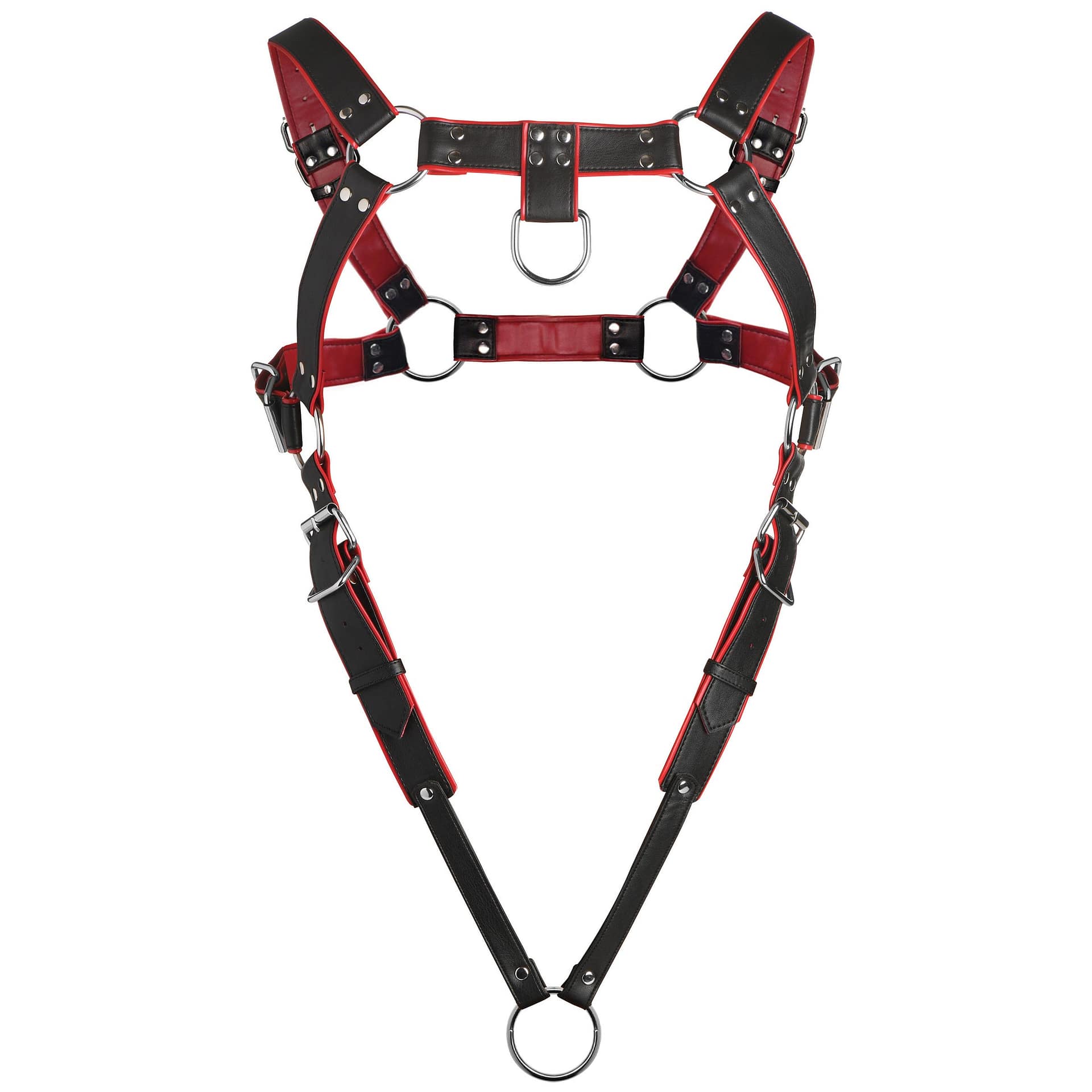 Harness your excitement in more ways than one! With this sexy, black and red, PU leather harness you can show off your body and tether the straps to your rod. Each strap is fully adjustable; use the nickel-free, metal buckles to cinch it tight. At the base of the harness is a 2 inch diameter (50mm) cock ring that serves the dual purpose of enhancing your erections and holding the harness in place. You can choose to expose your goods or cover them with a spacious, matching jock strap. The jock strap covers the front and still exposes your booty with two straps that go around the thighs and a belt that tightens around the waist. Spot clean with toy cleaner as needed and wipe with a soft cloth.