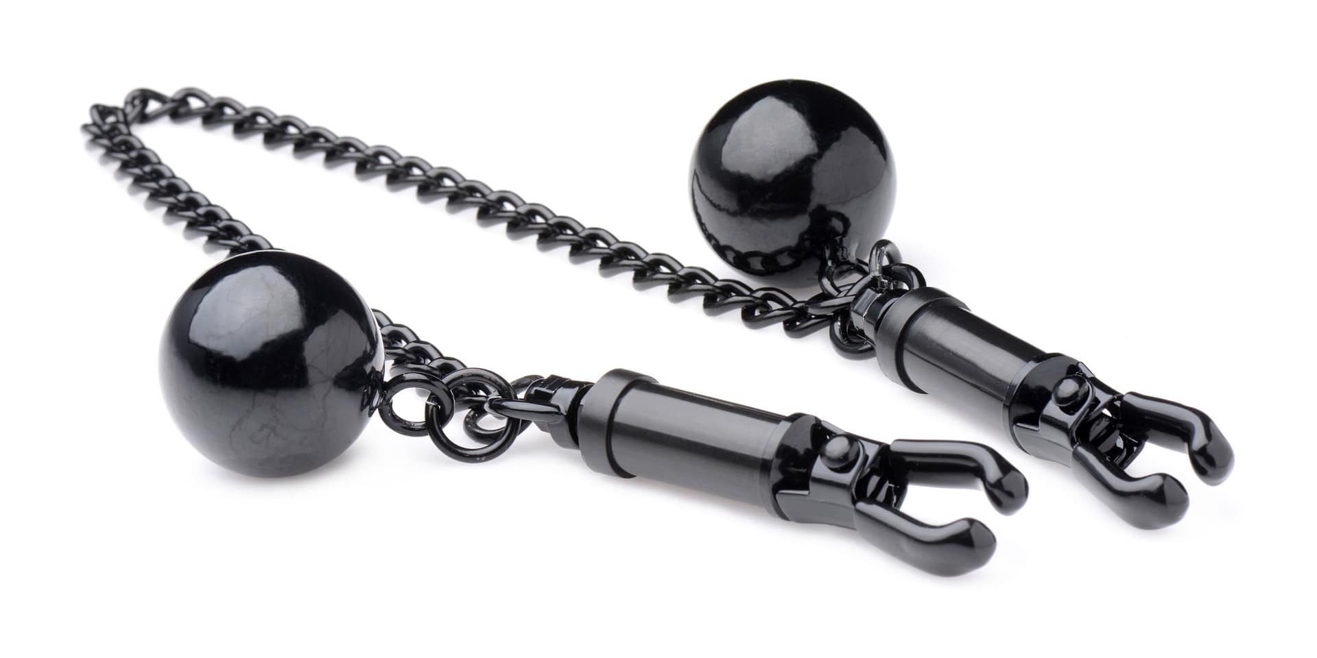 These sadistic clamps offer the framework for a wide array of pleasure play. Featuring 4 ounce dangling weights and a tuggable chain, these clamps are perfect for creating the nipple sensation play you crave. The clamps are highly adjustable via the twisting barrels. No forgiving spring loaded clamps here! Just screw down tight for unrelenting pressure. Rubber-coated tips ensure a good grip and add comfort.