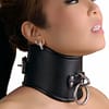 This 4-inch thick and tall curved posture collar is handmade of durable leather which will hold up to the struggling of the wearer. It forces the wearer to keep their neck perfectly straight with their chin out. It features a solid welded tri-ring on the front and a heavy locking roller buckle in back. It can be used with or without a lock.
