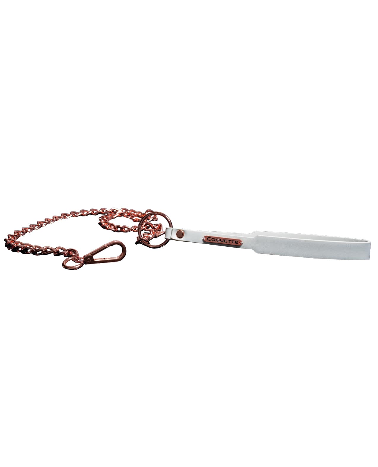 Pleasure Collection Leash. From Coquette. Metal COQUETTE charm. Metal clip compatible with bondage lingerie and other accessories. Sturdy 25.5 inch chain. Wrist strap circumference – 14 inches. Vegan Leather/Metal.
