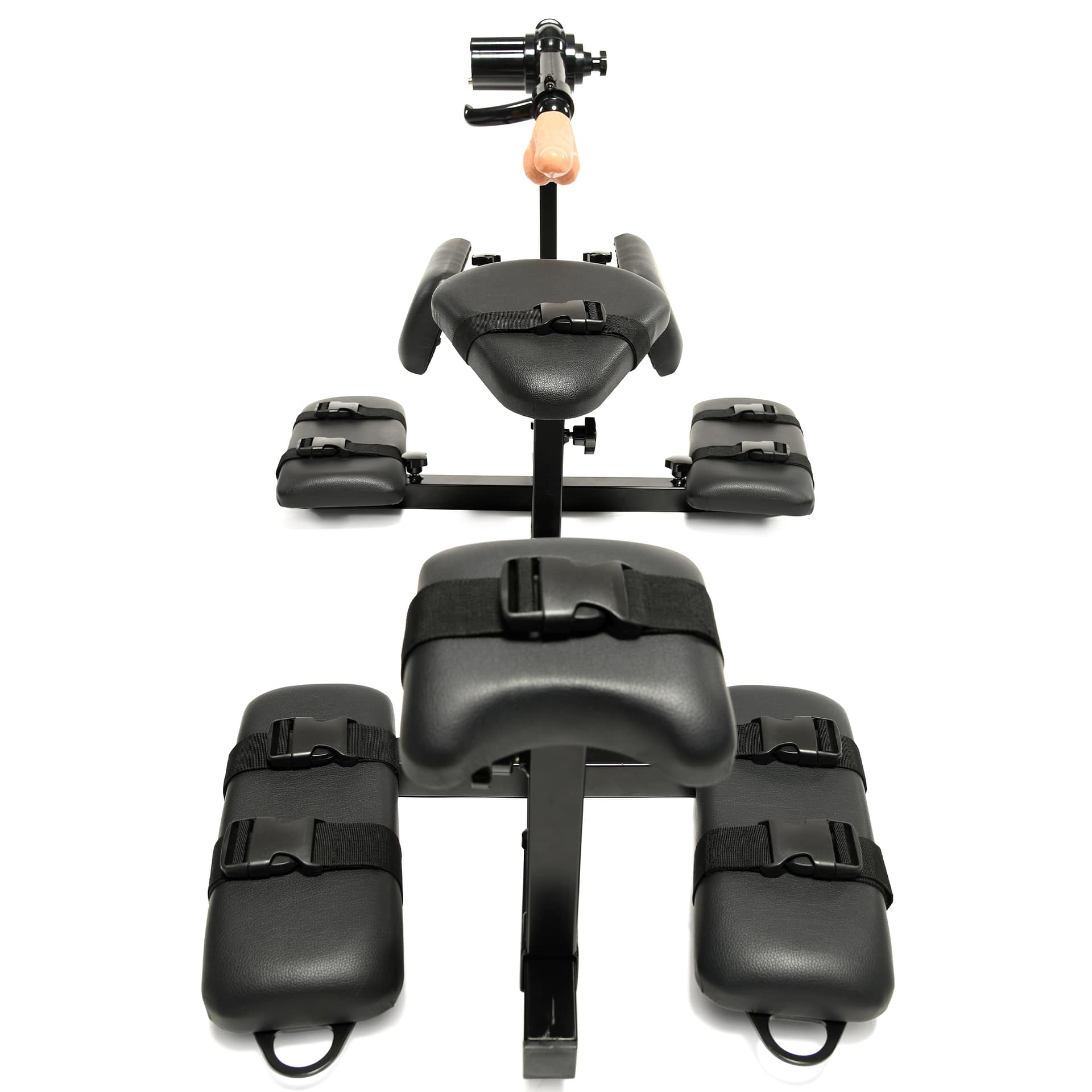 Note: Use dildo only with water-based lubricants. Chin rest, arm pads, torso pad, and sex machine bracket are all adjustable lengthwise along the main rod. Leg pads are attached to the main arm and are not adjustable.