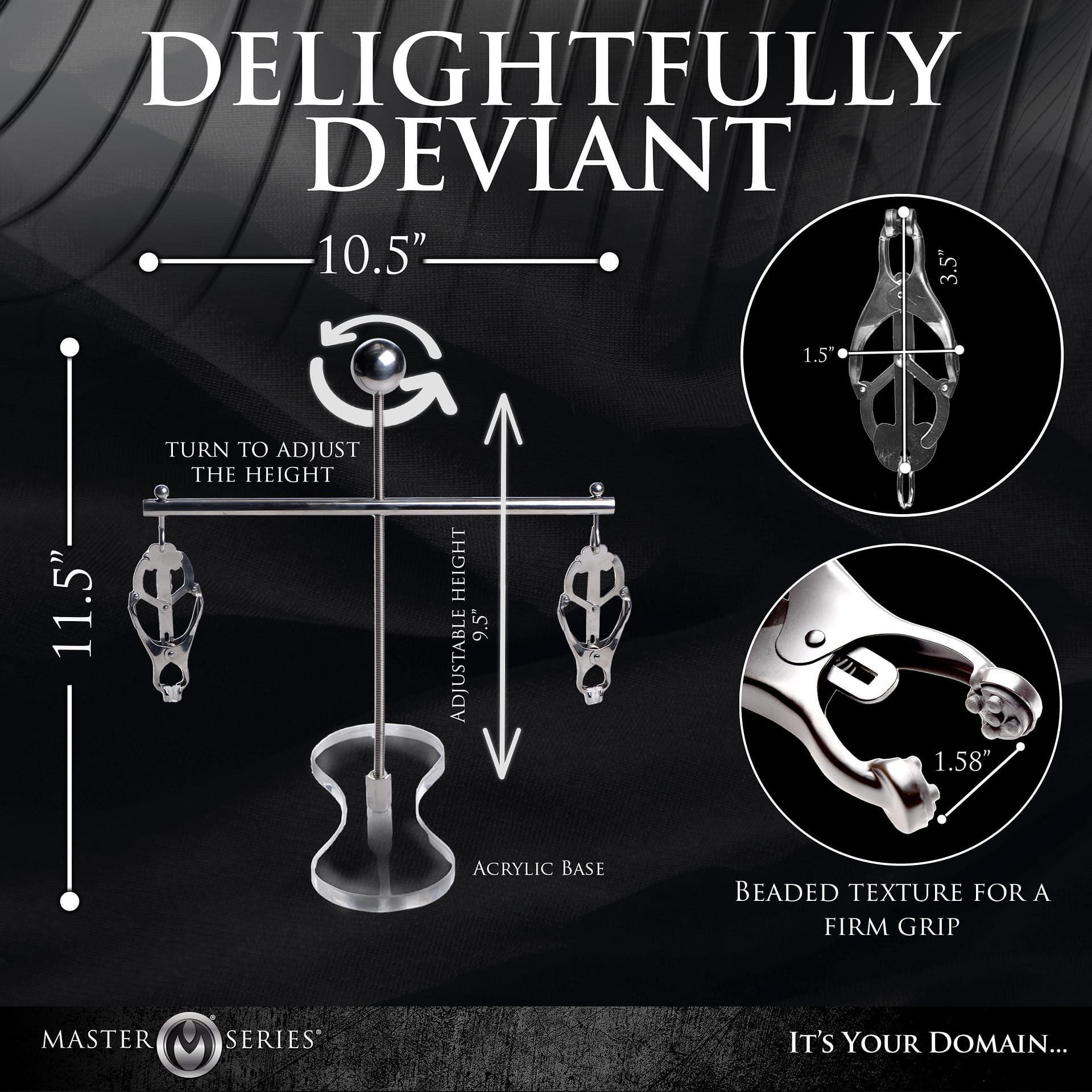 Put your submissive in a predicament: they can’t escape with this Tower of Pain! This tower has clover-style nipple-clamps that increase in pressure when they’re pulled on. The rubber tips protect the skin of the nipples and areola, but the pressure is wicked! The tower also adjusts in height so you can find the perfect height to torment them with! Made out of stainless steel, it is nickel-free and perfect for sensitive skin. The clear plastic acrylic pad sits between the nipples on their chest as a steady platform. It breaks down easily for storage or travel and can be cleaned with warm water and mild soap or a gentle cleaning solution.